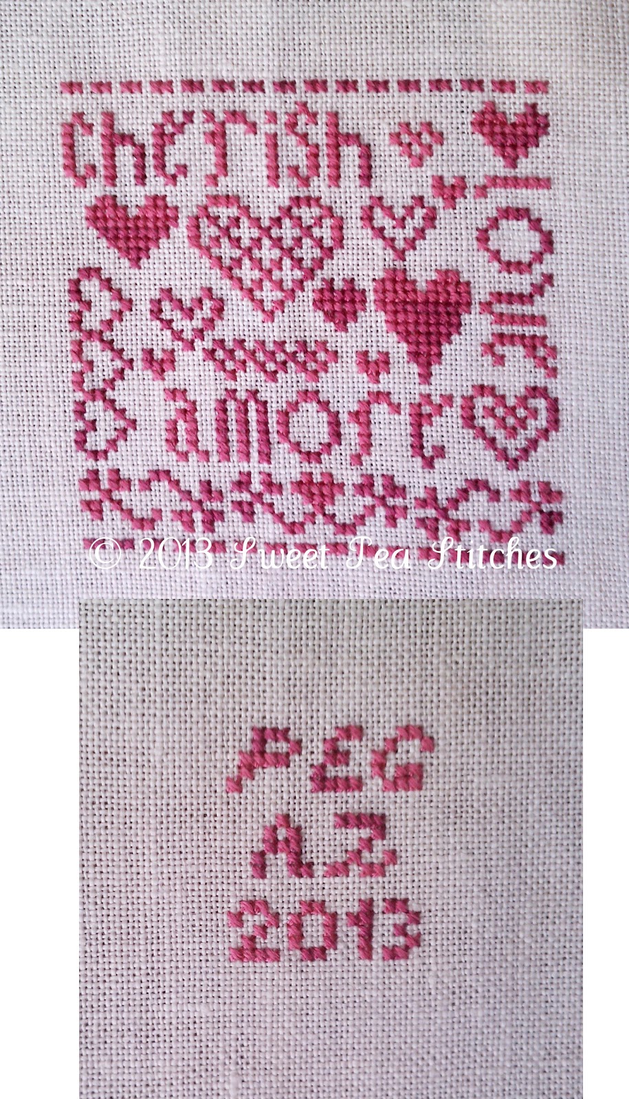 These are the pretty squares Peg stitched for me. The pattern is called Random Hearts by Erica Michaels, stitched on Vintage Strawflower with WDW Romance thread.